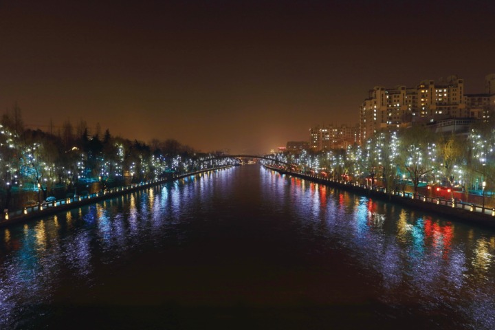 夜游运河,十里灯带,透着点点星光,如梦如幻。