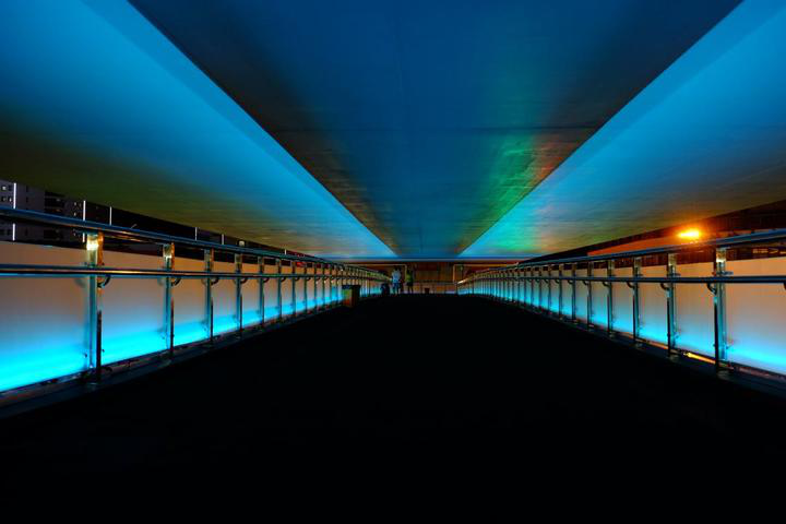 本次亮化提升改造的8座天桥,主要对桥梁上的钢结构架、楼梯、无障碍电梯等凸显桥梁结构和特色在部位进行投光打亮,并通过LED投光灯彩色光渲染添加节庆及环境热闹氛围。