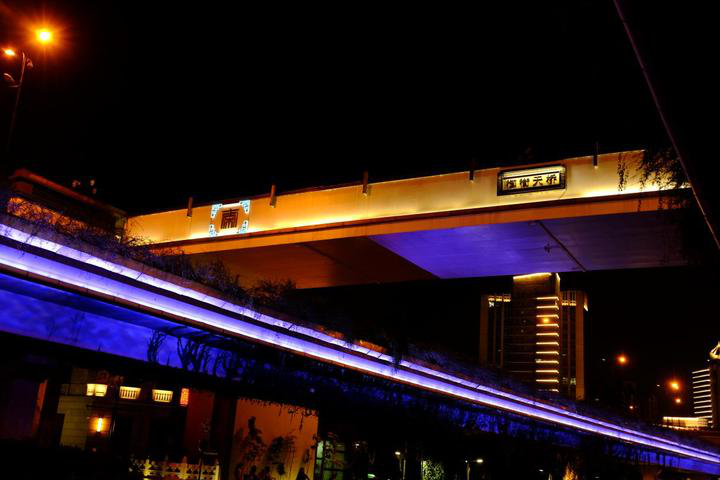 佑圣观天桥、复兴天桥、新塘路天桥采用单色白光投光灯整体打亮,夜景照明效果通透大气。