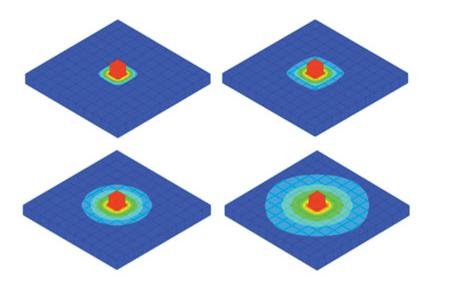 图5. 一个热体在薄金属板上,这种简单的有限元热模型通过参与冷却的板材体积的变化表现空间依赖性。这些模型的计算按照从左上到右下时间增加来进行的。