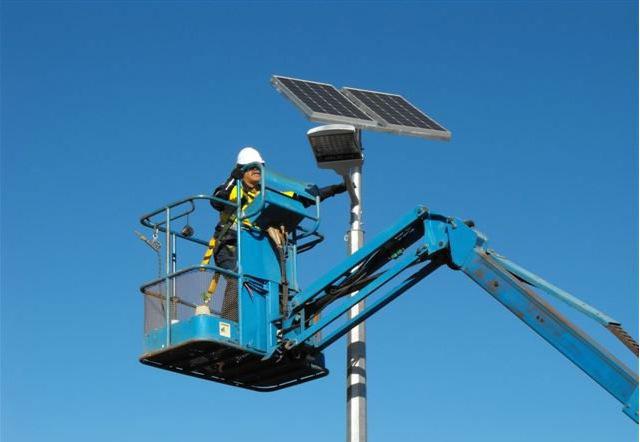 作为专业的路灯厂家,今天为你讲解如何来安装太阳能LED路灯,通过文字结合安装图这种图文并茂的方式来分步骤的解析安装过程,相信读者能以最快的方式学会安装流程,部分步骤适用后期更换太阳能LED路灯的部件。 安装步骤: 步骤一:安装太阳能LED路灯灯杆,可用高空升降机让灯杆捆绑后吊起竖直,理好电缆,通过螺栓紧固将LED路灯灯杆跟路灯基座联接牢固,调整垂直度,如下图: