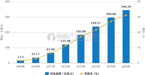 据前瞻产业研究院发布的《LED照明产业市场投资分析报告》数据显示,2015年全球LED照明行业规模为299.08亿美元,较 2014年的239.57亿美元增长24.84%,以产值计LED渗透率为27.2%。2016年全球LED 照明行规模将达到346.39亿美元,以产值计渗透率将达到31.30%。