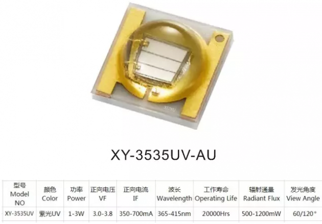 旭宇光电(深圳)股份有限公司作为国内知名LED封装企业,助力环保,助力LED紫外封装,在传统LED照明领域取得了不俗的成绩。目前在紫外LED领域厚积薄发,进行了一系列研发创新,以目前推出行业主流产品3535、5050陶瓷紫外molding封装为例,它们作为炙手可热的LED产品,品质和应用上已经实现了重大突破,以下为产品样图及参考参数。