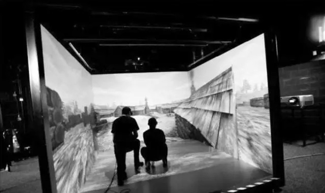 下图1是美军用CAVE系统的一个实例,在这个实例中使用了四套双投影机,但是地板面使用了向下投射的投影机,因此当人员进入观看时,地面上肯定会有人影,这对于LED显示屏是不存在的,LED虚拟现实系统下图2所示,但为了显示方便,仅仅示意性地画出了四个面。