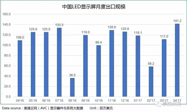 中国LED显示屏出口月度报告》数据显示,2017年4月我国LED显示屏产品出口市场规模高达1.41亿美元,创下单月历史新高,同比增长29.5%,环比增长27.2%。从增幅上看,4月份同比增速较上月上涨10个百分点,直接表明海外市场需求稳步增长,国内企业海外拓展势头继续向好。得益于LED小间距屏产品成本的快速下降,使得小间距产品加速向大屏显示应用领域渗透,进而带动LED显示屏整体市场的快速增长。此外,由于LED显示屏在大型赛事(如体育、竞技等)应用