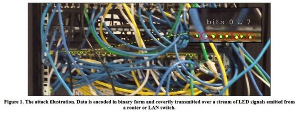 以色列本·古里安大学的研究人员开发出恶意程序,当安装到路由器或网关上时它能控制设备上的 LED 灯,使用 LED 以二进制格式向附近的攻击者传输数据,攻击者可以使用视频记录设备来接收数据。研究人员此前还发现能利用目标电脑上的机械硬盘声音以及硬盘 LED 灯等方法窃取不联网设备上的数据。