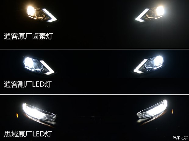 面对灯光时,可以看到思域的原厂LED给人的感觉最亮,逍客的后装LED灯光其次,而逍客原厂卤素灯虽然感觉上不如LED,但也非常亮。接下来再来看看照射在地面上的感觉。