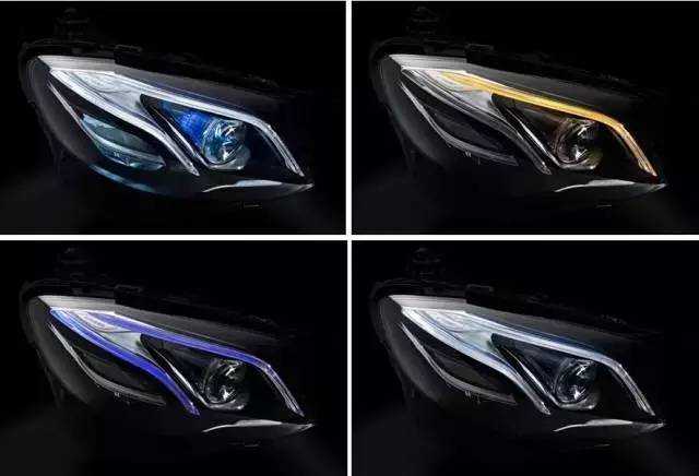 在全新 E 级上,奔驰配备了 LED 几何多光束大灯技术。听起来高大上,实际上,每个大灯都是 由 84 颗能够独立调节的 LED 组成,还能以每秒 100 次的频率扫描计算路况。