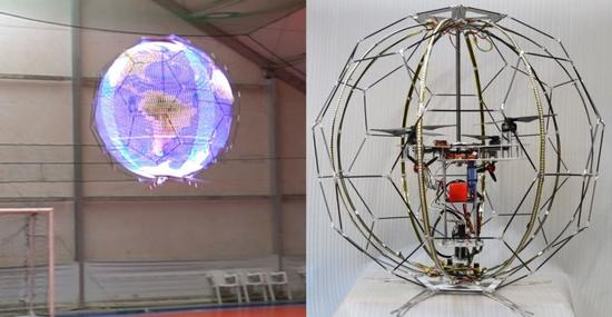 球形框架的直径约为88厘米(约34.5英寸),整个装有无人机的装置重量仅为3.4千克。LED显示屏的分辨率为144 136,里面是一个从底部突出的双臂无人机。