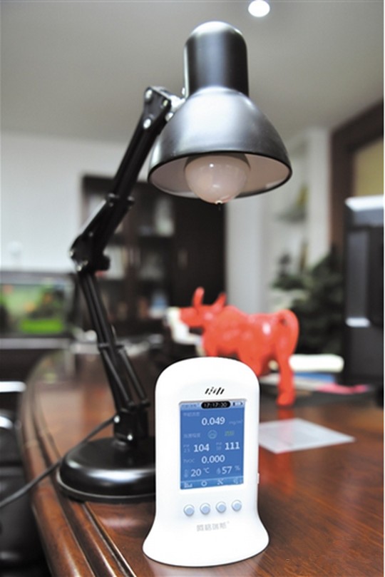上午11:18,在成都晶晟节能科技有限公司(以下简称“成都晶晟”)创始人何育林面积约40平方米的办公室里,记者启动了家用空气质量检测仪,在紧靠检测仪的上方打开那只可以净化空气的特殊灯泡。测试之初,检测仪显示室内PM2.5值为135、PM10为150,甲醛0.08mg。15秒后,检测仪的相关数值开始缓慢下降。测试时间到3分钟时,室内的空气质量与此前相比有了明显变化,PM2.5值降为50、PM10值降为50,甲醛为0.03mg。“如果继续照明的话,空气还会进一步改善。”何育林说道。