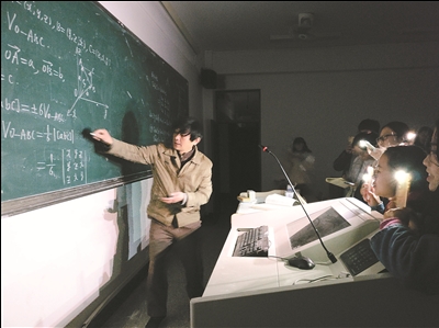 近日,一张成都学院“突然停电的高数课堂”照片走红网络。图片上,一道道光从讲台下聚拢到黑板上,手机“蜡烛”照亮了黑板,学生们都围在讲台边,神情专注。
