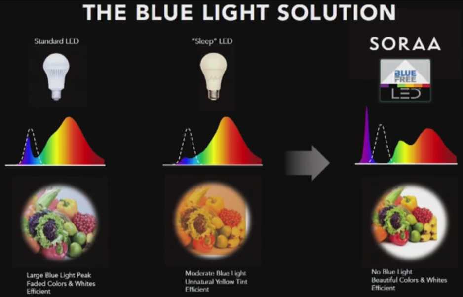 而中村修二成立公司Soraa, 亦往UV-LED的方向走,为了做到这一点,他们将GaN LED的发光峰值设计在在410nm~420nm之间的紫光,并搭配多磷光体混合物,使整个白光光谱覆盖至700nm,这表示整个白光的频谱将涵盖人眼可视波长范围(一般来说,人眼可是范围约为400nm~700nm),从紫光(400nm)到深红色(700nm)连续且完整,这样的好处是,使用者可以看到较为真实的白色。