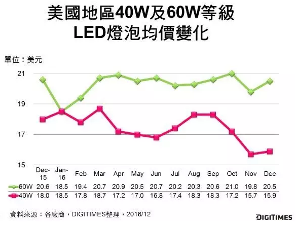 2016年12月美国地区40W与60W等级LED灯泡均价分别为15.9、20.5美元,分别较10月下跌7.6%、2.4%,两者价差放大至4.6美元。