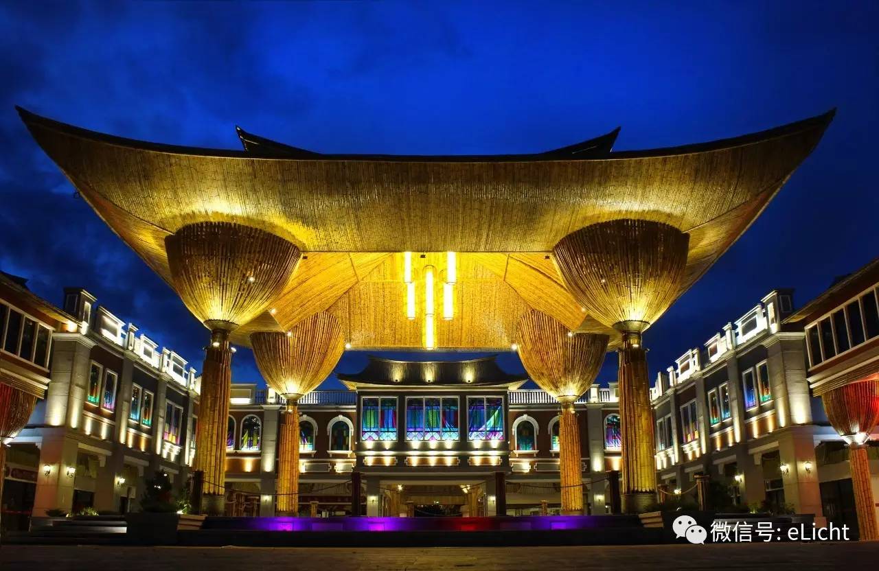 竹子本身并不是金色,而是青色的,但时间一长颜色会偏黄。因此,竹建筑的照明采用聚光和部分泛光的方式,有区别地营造气氛。在晚上,可以看到竹建筑在灯光下呈现金碧辉煌的效果。业主看到这个效果后,非常满意。因为金色代表财富,但是用金铂来做成本很昂贵,现在用灯光同样达到了金碧辉煌的效果。