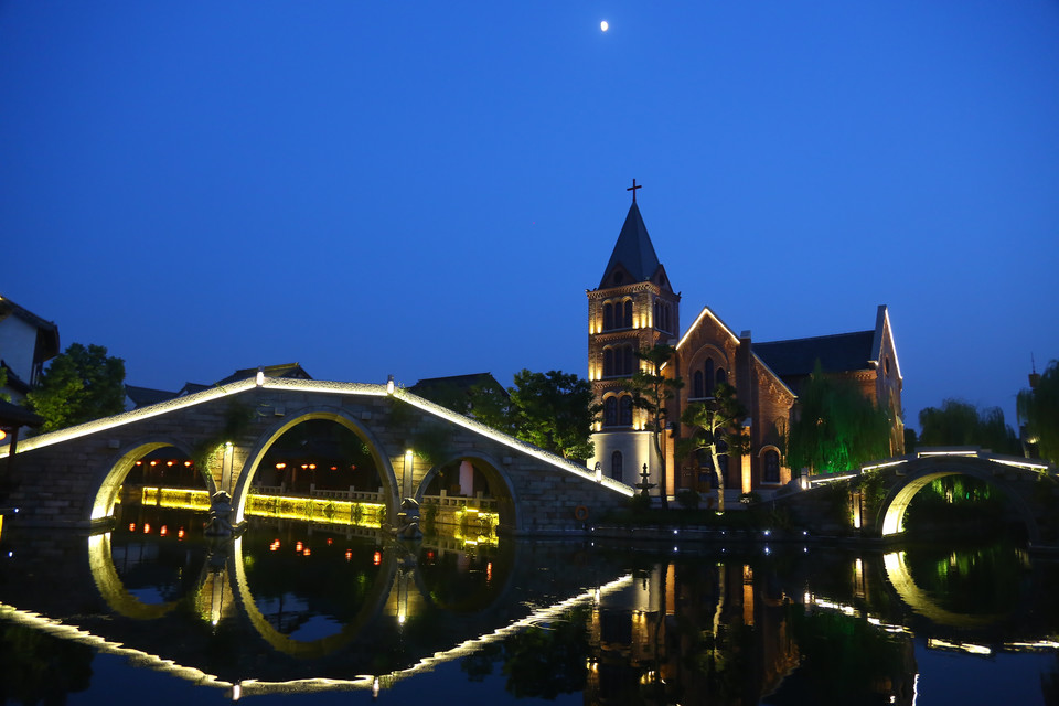洗墙灯将金黄色的灯光洗刷满整个外部墙面,为这百年建筑增添一种复古的气息。