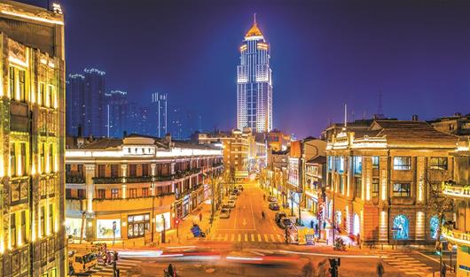从一元路至江汉路,为了展现这一段的古典文艺风貌,夜景照明以暖白、暖黄光为主,彰显文艺浪漫的气息。江汉路至前进一路段,以琥珀色灯光为主,并在现代商业建筑上点缀少量彩色光源,烘托出商业氛围。从前进一路至武胜路段,以现代风格为主。目前,这一路段的亮化提升仍在进行中。