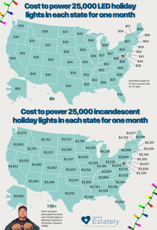 Estately粗略估计在美国地区用在这些电灯上的电费,以每月31天每天5小时驱动25000个白炽灯泡运行计算,最低的要属路易斯安那州,在圣诞期的1个月内电费需要2582美元;最高的要属夏威夷,1个月的电费为7552美元。