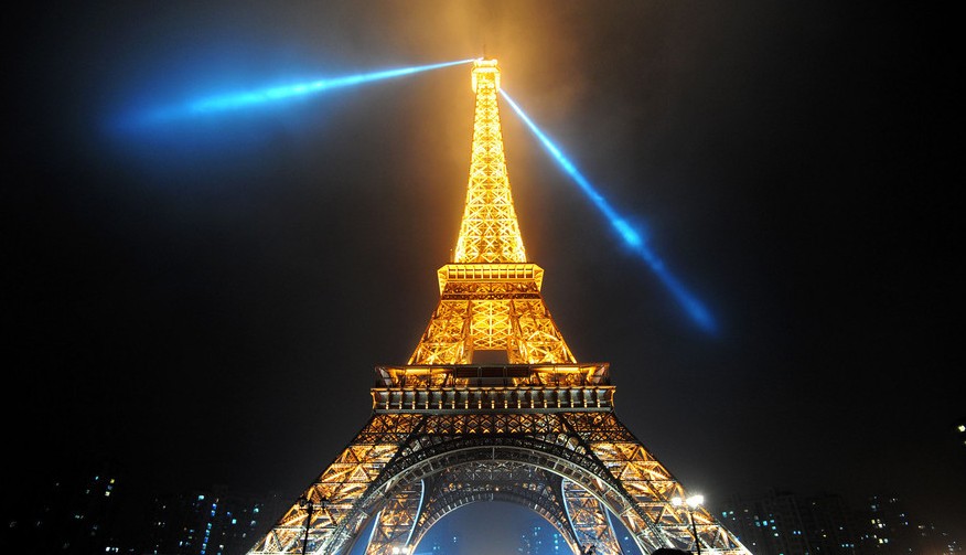2016年10月7日晚,浙江省杭州市,市民冒雨在欣赏“埃菲尔”铁塔灯光秀。“山寨”版埃菲尔铁塔位于杭州市郊,这座铁塔总高108米,按照法国原版艾菲尔铁塔三比一的比例建造而成,建筑结构与法国那座塔保持一致。国庆节期间铁塔举行了灯光秀表演,吸引了众多市民前往欣赏。2016年10月7日晚,浙江省杭州市,市民冒雨在欣赏“埃菲尔”铁塔灯光秀。