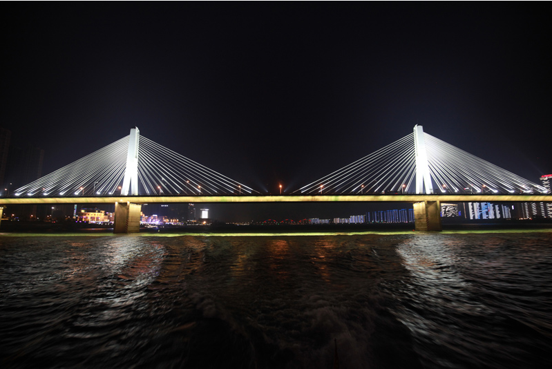 银盆岭大桥是双塔单索面斜拉桥,全长3616米,两侧设有非机动车道和人行道。远望过去,令人心醉