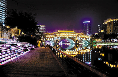 望江楼、廊桥、合江亭披上盛装……自东向西,每走一处,处处见景。光与光的交汇,影与影的交融,令人陶醉。一路行走,一路惊叹,武侯祠的古建筑,翼角舒展如鸟翼,瓦面晕染如水墨,红墙和地面斑驳的光影,各种彩带的点缀,给人以古代商埠的繁华璀璨之感;机场路的人行天桥上,浅浅的蓝,暮色的黄,火烧的红,画出靓丽的风景线。