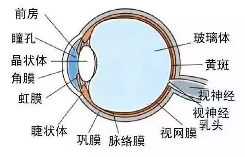 光线通过眼睛发生的主要光学过程为:当波长为380nm~780nm的可见光辐射进入眼睛的外层透明保护膜后,发生折射,光线从角膜进入瞳孔,进入的光量通过瞳孔的收缩或者扩张自动地得到调节。光线通过瞳孔和晶状体后,由晶状体和透明玻璃状体液将光线聚集在视网膜上,人眼结构示意图如图1所示。