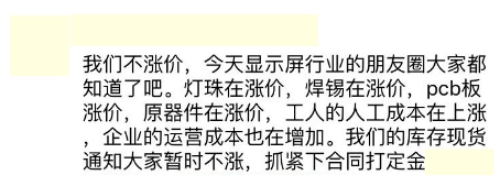 一位显示屏业者在朋友圈发布消息说“灯珠在涨价、焊锡在涨价、PCB板涨价、原器件涨价,工人的人工成本在涨,企业的运营成本也在增加。我们的库存现货通知大家暂时不涨。”
