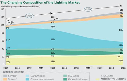 据波士顿咨询公司(BCG)报告显示,随着LED灯开始大肆削减传统灯具销量,全球照明市场正发生翻天覆地的变化。2010-2014年全球照明市场增长3%,营收为1120亿美元,预计到2020年将增至1330亿美元。此外,LED市场份额将从2014年的5%增至2020年的45%,全球照明市场利润将保持相对稳定,从当前的49亿美元增至2020年的60亿美元。